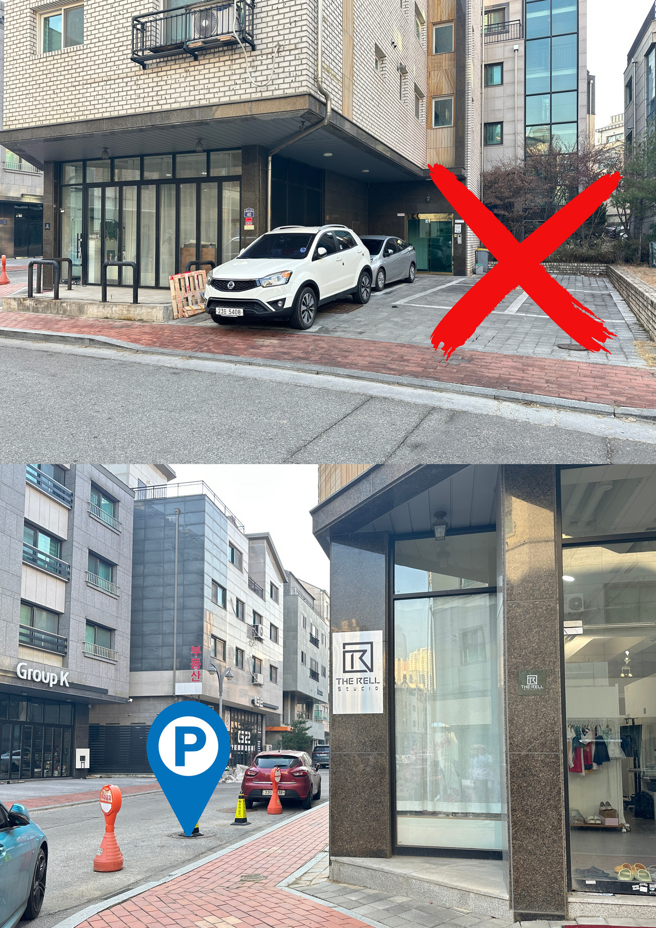 더렐스튜디오 주차안내사항1. 스튜디오 오른쪽에 있는 빌라 입구쪽에는 주차가 불가합니다. (사진1)